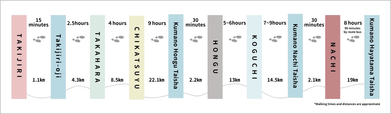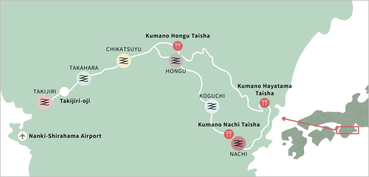 Proceed along the road from Kouchi to Kumano Nachi Taisha, " Ohgumotorigoe."It's a tough mountain path like going through clouds, and it's the hardest part of the Nakahechi route. We aim to visit Kumano Nachi Taisha Shrine while visiting famous places such as "Waroudaishi," a large rock that the gods of Kumano chatted and laughed while sitting in a circle, and "Kusuno no Kubo Hatago ato," which once flourished in Hatago.