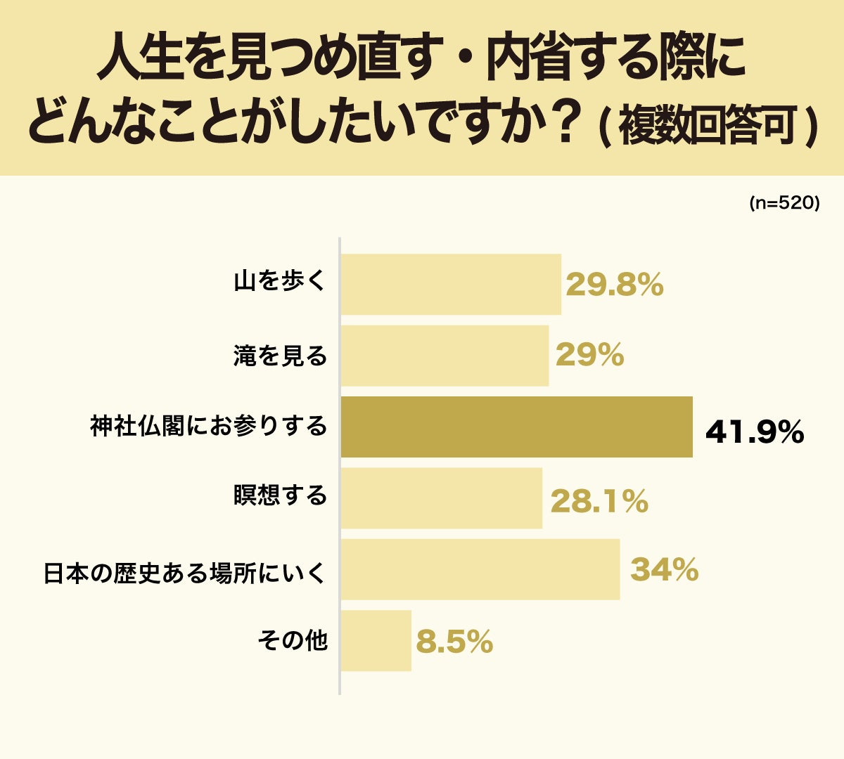 - 人生を見つめ直す・内省する際にしたいことは、「神社仏閣にお参りしたい」が最多