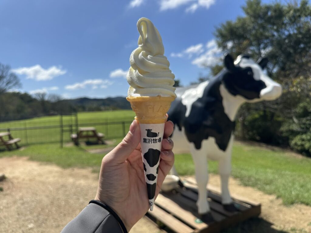 高原の広々とした放牧地で牛たちを一年中のびのびと放牧し、牧場内の工房でソフトクリームやプリン、ロールケーキなどを製造・販売している黒沢牧場。中でも人気なのが、搾りたての生乳を惜しみなく使ったソフトクリームです。
